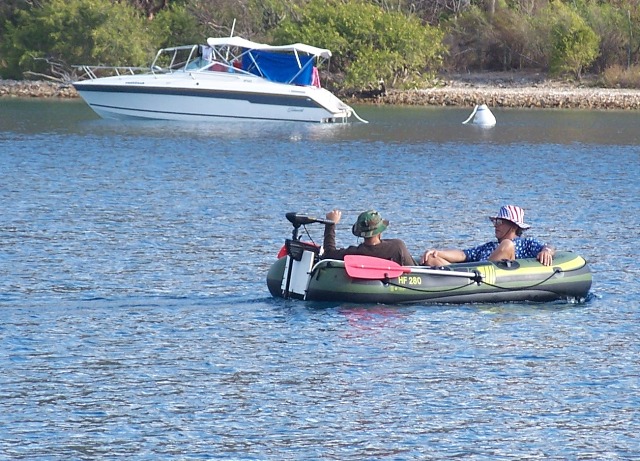 | An electric outboard runs two people into the Pirate Bar, Norman's Bight | |