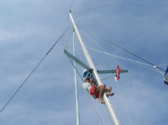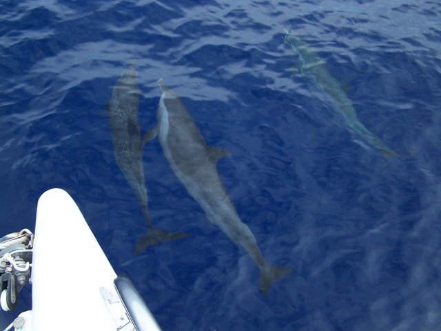 | Dawn and Maria successfully compete with the beauty of Bougainvillea | Dolphins play at our bow |